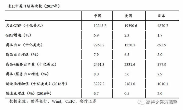 表1是基于2017年的数据,对中、美、日经济产出的基本比较。2017年,中国GDP是12万亿美元,美国是19万亿美元,世界第三大经济体日本GDP不到5万亿美元。中国的经济总量已经是日本的2.5倍。