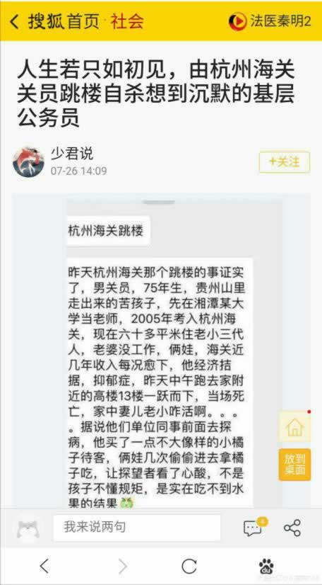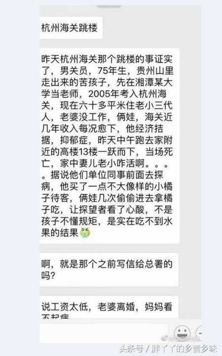 以下为天涯网友评论:杭州海关关员跳楼身亡。看别人说的原因是工资低,在杭州住着60平米的房子,要养活老少三代,父母,妻子,两个小孩,妻子没活。这事到底他的工资有多低,那人可没说,我在网上的评论中摘了一个说杭州公务员工资的,如下:(杭州公务员还是海关,再差连公积金房补一年也有15万左右。真以为步行街收入满天下,没到30自杀以谢天下?)看这样他一年至少也能挣个十万八万的,这钱都花哪去了,居然生活拮据,以至于买了几斤桔子招待客人,两个小孩还总去拿着吃?再说了杭州那活那么多,媳妇干啥要呆着?难道找不到活干嘛?那么多外地进城的都有活干,如果她要干活却没活干,那是为啥?是不是沾着公务员的边就自命清高,不能干低等活了?再说了两个父母干嘛也要白呆着,那玩意捡废品也能挣钱吧?这估计就是一家老小都自诩为公务员阶层了,都只能过养尊处优的生活了。这里边还有一个生活方式呢,那就是杭州的房子那么贵,那60平米能卖不少钱,拿着它去乡下那也是有钱人,干啥非得呆在杭州?很显然就是想高攀富贵,想做人上人呢。这就是想爬爬不上去,活活吊死在富贵地方的人。最后我还是纳闷,那一年十万八万的收入都干啥去了?居然生活拮据?我们这一家的收入一年有个四五万都是高的,照他那样还不都饿死了?