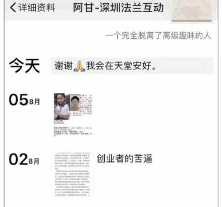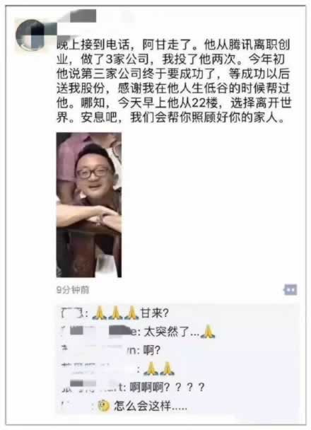 8月7日晚上,一位投资人在朋友圈发布了一条关于“阿甘走了”的内容,创业者甘来于8月7日从22层楼跳下,结束了自己的声明。甘来创业3次,却都遭遇了失败,没有能够扛得住心里的压力,最终选择了一跃结束自己的声明。