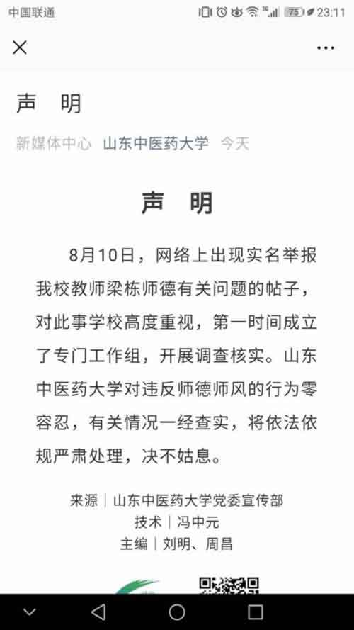 8月11日,对于“山东中医药大学梁栋性侵”的实名举报,山东中医药大学作出回应,并以山东中医药大学党委宣传部的名义,在其官方微信公众号上发布了一份声明。