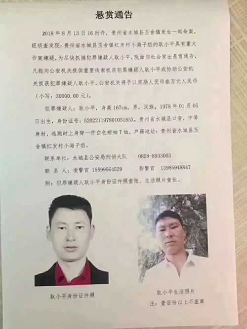 8月14日下午,贵州六盘水市水城县公安局发布警情通报,一名叫做耿小平的男子因为涉嫌一起命案被警方通缉,警方悬赏3万元,寻找此人行踪。