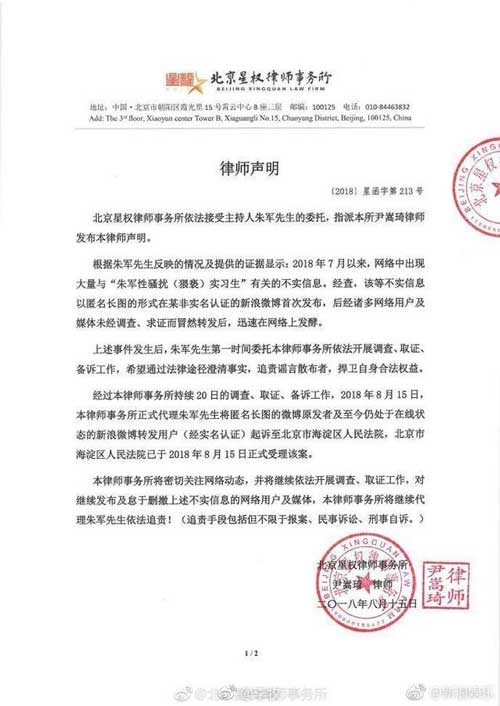 8月15日中午,朱军就“性骚扰实习生”传闻发布律师声明,追责谣言散布者。声明中称自7月以来网上传播与“朱军性骚扰实习生”有关的不实信息,后经诸多网络用户及媒体未经调查、取证而贸然转发后,迅速在网络上发酵。声明中称:“将继续依法开展调查取证工作,对继续发布及怠于删撤上述不实信息的网络用户及媒体,将依法追责!