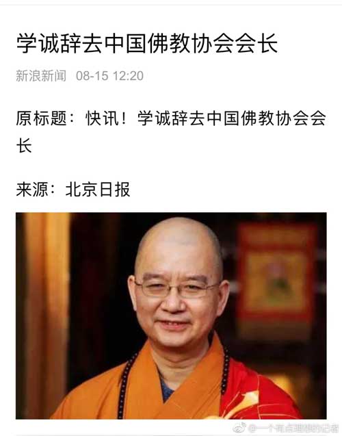 记者从中国佛教协会获悉,在今天(15日)召开的中国佛教协会第九届理事会第三次会议上,根据会长会议提议,会议接受学诚辞去中国佛教协会会长、常务理事、理事,同意由演觉副会长临时主持中国佛教协会工作。