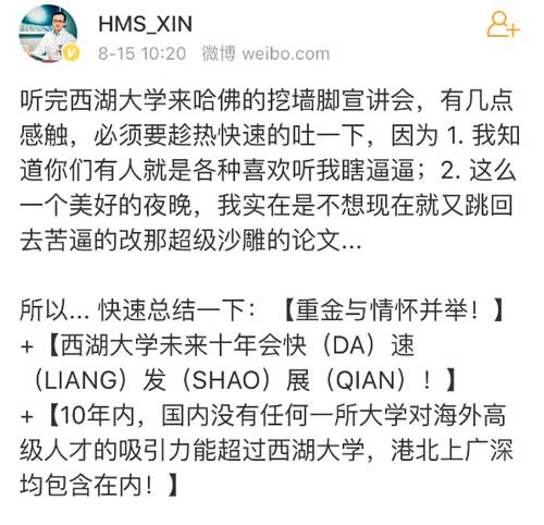 所以... 快速总结一下:【重金与情怀并举!】+【西湖大学未来十年会快(DA)速(LIANG)发(SHAO)展(QIAN)!】+【10年内,国内没有任何一所大学对海外高级人才的吸引力能超过西湖大学,港北上广深均包含在内!】