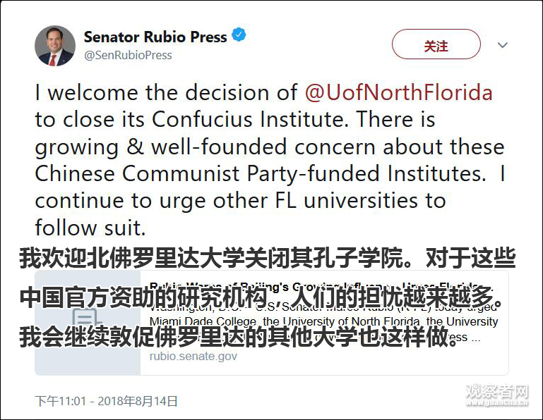 据观察者网2月份报道,鲁比奥早就开始为佛州孔子学院的关闭“推波助澜”。