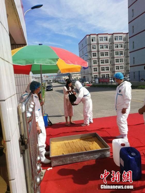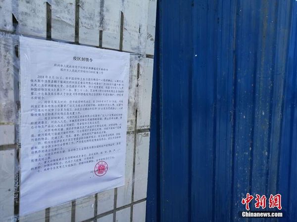 近日,从黑龙江调往河南郑州双汇食品有限公司的260头生猪中,30头因患非洲猪瘟疫情死亡。16日,郑州官方下达封锁令将该公司屠宰厂划为疫点计划封锁6周,展开疫情应急处置。17日上午,记者赶往位于郑州经开区的涉事企业注意到,该企业北大门已被封闭,南门处有数名身着隔离服的人员把守,所有进出人员需经逐一消毒、检查后放行。图为工作人员向一名出厂人员手臂上喷洒消毒液。刘鹏 摄