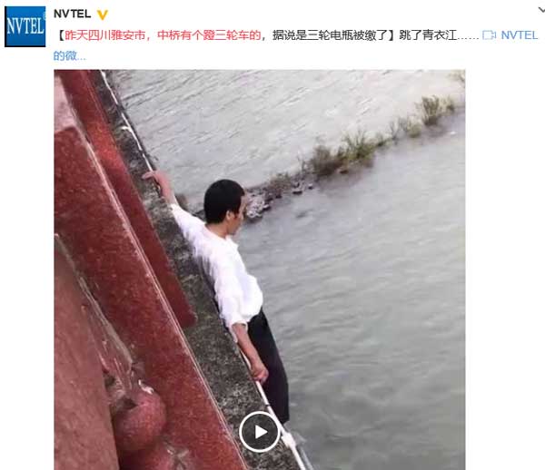 网曝四川雅安一男子因三轮车被缴 跳青衣江自杀