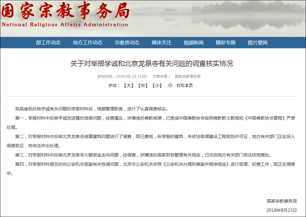 第一,举报材料中反映学诚发送骚扰信息问题,经查属实,涉嫌违反佛教戒律,已责成中国佛教协会按照佛教教义教规和《中国佛教协会章程》严肃处理。