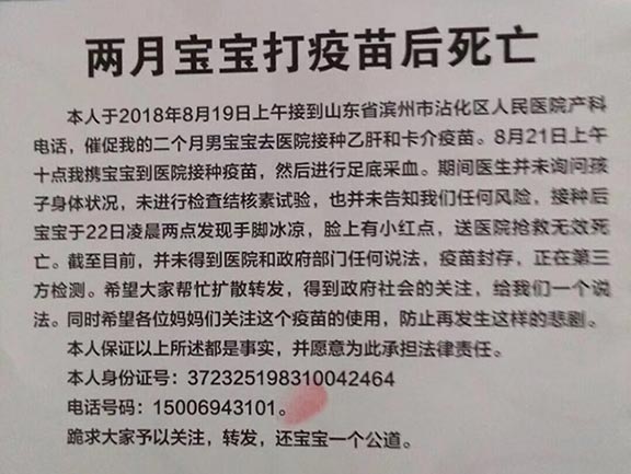 本人于2018年8月19日上午接到山东省滨州市沾化区人民医院产科电话,催促我的二个月男宝宝去医院接种乙肝和卡介疫苗。8月21日上午十点我携宝宝到医院接种疫苗,然后进行足底采血。期间医生并未询问孩子身体状况,未进行检查结核素试验,也并未告知我们任何风险,接种后宝宝于22日凌晨两点发现手脚冰凉,脸上有小红点,送医院抢救无效死亡。截至目前,并未得到医院和政府部门任何说法,疫菌封存,正在第三方检测。希望大家帮忙扩散转发,得到政府社会的关注,给我们一个说法。同时希望各位妈妈们关注这个疫苗的使用,防止再发生这样的悲剧。