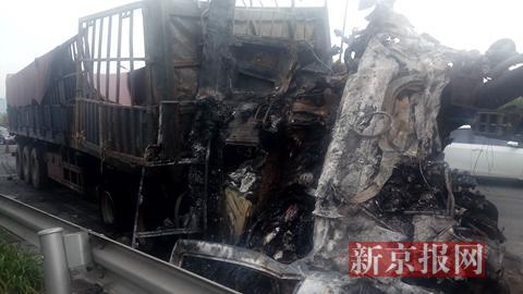 (原标题:东四环主路两大货车相撞致2人死亡 大货车驾驶室被烧毁)