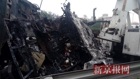 上午新京报记者在现场看到,后车车头变形严重,轮胎及车内座椅被烧毁,前车汽油箱也破裂。公安、交警以及相关救援单位正在事故现场勘查并清理,目前,此事故正在进一步调查处理中。