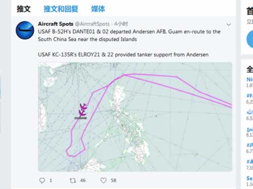 原标题:美"飞机守望"账号披露:2架B-52轰炸机飞进南海空域