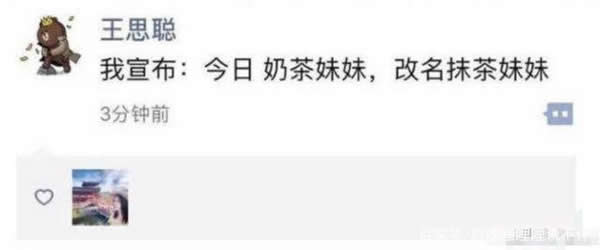原标题:王思聪朋友圈调侃章泽天,宣布奶茶妹妹改名为“抹茶妹妹”?