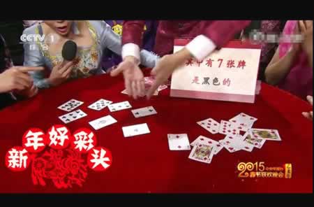 近日,2015年春节联欢晚会上周家宏表演的魔术节目《纸牌幻想》被网友揭秘,技巧也在网络热传,而一系列的穿帮镜头相继被网友扒出。据秋雨揭秘,在魔术师周家宏旁边坐的朱迅和后面的贾玲是托,大家看到表演魔术中间贾玲给了主持人朱迅一张牌。黑色的是19张,手快直接把牌移动走了,魔术师的手必须要快。这个魔术很简单,不用任何手法,上手组牌的时候不是随机分。你把一组牌做好是23张里面有11张红的。12张黑的。11张红的里面放个红心3。(文字来自:中国网)