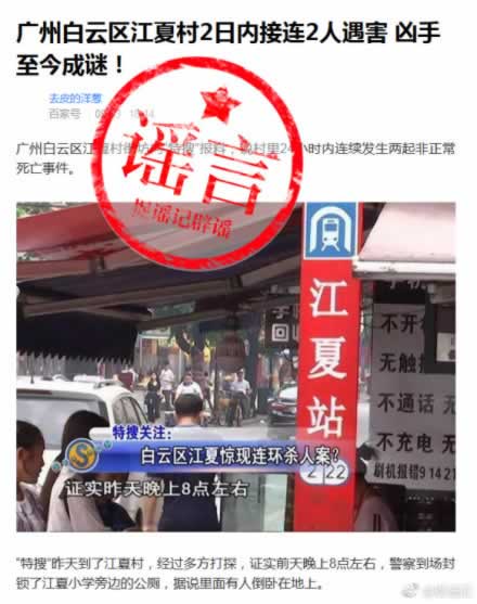 (原标题:《广州警方辟谣:网传“白云区江夏村连环杀人案”不实》)