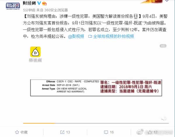 #独家#京东集团CEO刘强东在美涉嫌涉强暴女大学生被捕# 明尼拿波里斯警局:刘强东涉嫌强暴重罪,而不是普通的性侵。明尼拿波里斯警察局4日公布京东商城创始人监首席执行官刘强东案件的报告,根据内容显示,刘强东於8月31日当晚,是以涉嫌「强暴」(Rape)重罪(felony)遭逮捕。