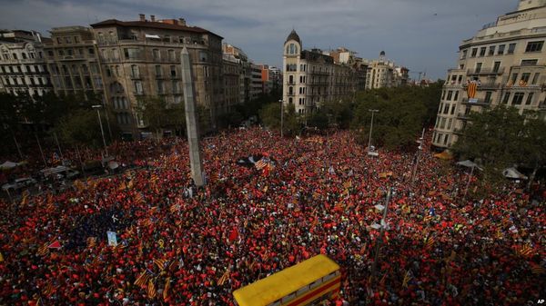 据警方表示,大约一百万抗议者星期二聚集在巴塞罗那主要街道,要求加泰罗尼亚地区脱离西班牙政府而独立。