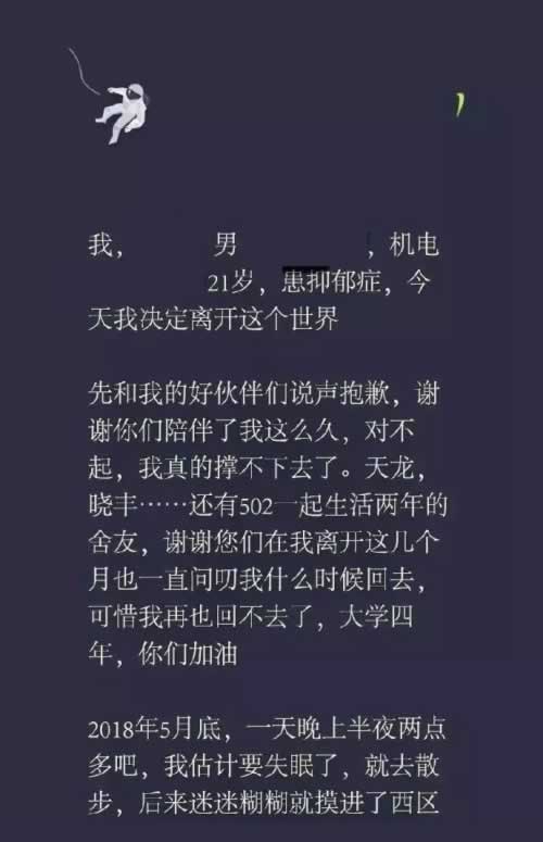 我,男,机电XXX班 21岁,患抑郁症,今天我决定离开这个世界先和我的好伙伴们说声抱歉,谢谢你们陪伴了我这么久,对不起,我真的撑不下去了。天龙,晓丰……还有502一起生活两年的舍友,谢谢您们在我离开这几个月也一直问叨我什么时候回去,可惜我再也回不去了,大学四年,你们加油