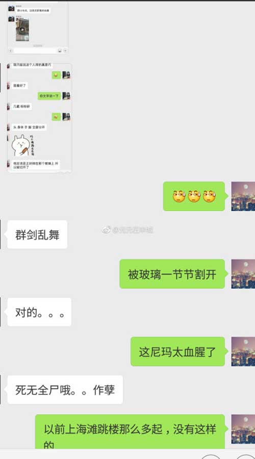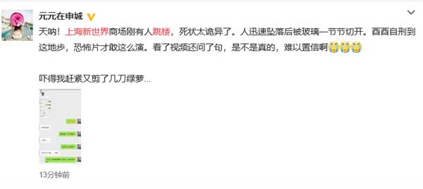 网友@元元在申城:天呐!上海新世界商场刚有人跳楼,死状太诡异了。人迅速坠落后被玻璃一节节切开。酉酉自刑到这地步,恐怖片才敢这么演。看了视频还问了句,是不是真的,难以置信啊[泪][泪][泪] 吓得我赶紧又剪了几刀绿萝...