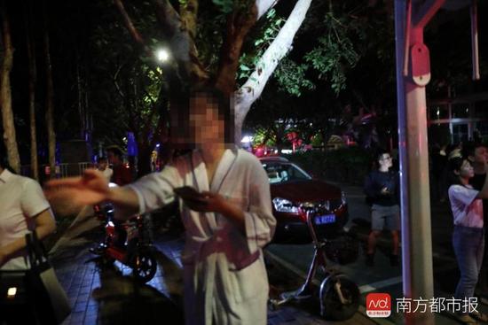 南都记者在事发后第一时间到达了现场。可以看到,楼下的围观群众比较多。事发楼栋有一个东方银座美爵酒店,南都记者看到有不少住客跑了出来,有的身上甚至只裹了浴巾。