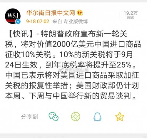 特朗普政府宣布新一轮关税,将对价值2000亿美元中国进口商品征收10%关税。10%的新关税将于9月24日生效,到年底税率将提升至25%。中国已表示将对美国进口商品采取加征关税的报复性举措;美国财政部仍计划本周、下周与中国举行新的贸易谈判。