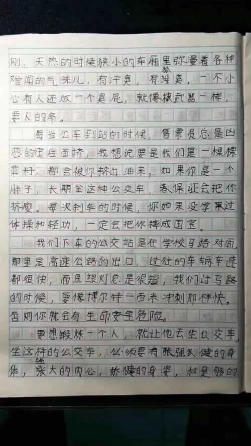 9月17日,四川泸州合江县一名小学生吐槽公交车拥挤的作文在当地朋友圈热传。小朋友的这篇作文,题目叫 《奇特景观之“坐公交”》,讲述了自己每天上下学挤公交的心酸路程,各种欲抑先扬、烘托渲染,形容词、比喻、排比 手法信手拈来。被大赞 “有才华”“作文小能手”“写得太好了!”