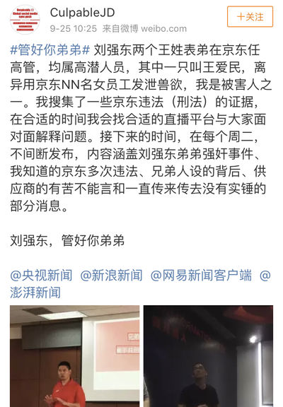 #管好你弟弟#刘强东两个王姓表弟在京东任高管,均属高潜人员,其中一只叫王爱民,离异用京东NN名女员工发泄兽欲,我是被害人之一。我搜集了一些京东违法(刑法)的证据,在合适的时间我会找合适的直播平台与大家面对面解释问题。接下来的时间,在每个周二,不间断发布,内容涵盖刘强东弟弟强奸事件、我知道的京东多次违法、兄弟人设的背后、供应商的有苦不能言和一直传来传去没有实锤的部分消息。