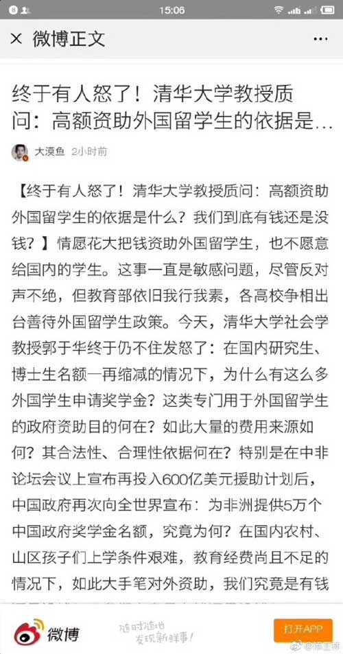 【终于有人怒了!清华大学教授质问:高额资助外国留学生的依据是什么?我们到底有钱还是没钱?】情愿花大把钱资助外国留学生,也不愿意给国内的学生。这事一直是敏感问题,尽管反对声不绝,但教育部依旧我行我素,各高校争相出台善待外国留学生政策。今天,清华大学社会学教授郭于华终于仍不住发怒了:在国内研究生、博士生名额一再缩减的情况下,为什么有这么多外国学生申请奖学金?这类专门用于外国留学生的政府资助目的何在?如此大量的费用来源如何?其合法性、合理性依据何在?特别是在中非论坛会议上宣布再投入600亿美元援助计划后,中国政府再次向全世界宣布:为非洲提供5万个中国政府奖学金名额,究竟为何?在国内农村、山区孩子们上学条件艰难,教育经费尚且不足的情况下,如此大手笔对外资助,我们究竟是有钱还是没钱?