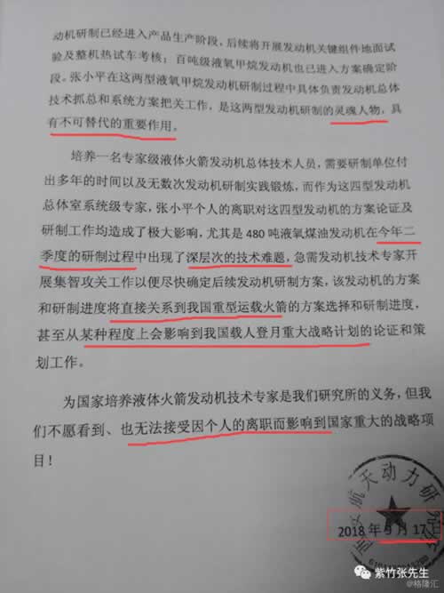等张小平走了一段时间,慢慢发现不对劲了,公文中写的清清楚楚。今年二季度在研制480吨液氧煤油发动机的时候出现了“深层次”的技术难题,急需发动机技术专家“集智”以便推进项目,所以发文向国家要人,期望张小平回来。二季度是4~6月,出现了重大的问题需要专家,卡住了项目进度,才有了9月份的这份要人公文。