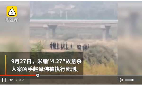 9月27日,米脂县"4.27"故意杀人案罪犯赵泽伟在陕西省米脂被执行死刑。赵泽伟因工作、生活不顺心生怨恨,蓄意报复曾就读初中的在读学生,连刺21名学生致9人死亡。去枪决现场路上,当地不少村民沿路围观。