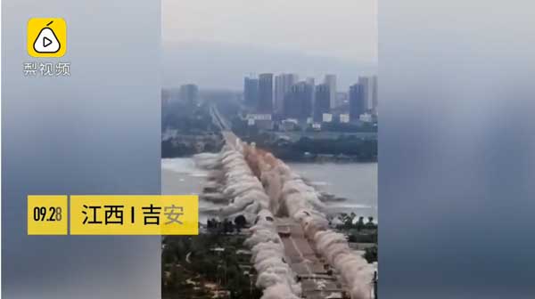 9月28日,江西吉安,上午起爆信号过后,赣江大桥成功爆破。一声巨响后,全长1577米的大桥瞬间崩塌,巨大的灰尘与烟雾升起,场面壮观。2016年,赣江大桥经检测为危桥,拆除后将在原址重建。爆破后的江面浮起大量死鱼,许多市民乘船争相捞鱼。