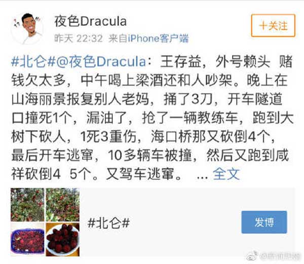 据网友消息:王存益,外号赖头 赌钱欠太多,中午喝上梁酒还和人吵架。晚上在山海丽景报复别人老妈,捅了3刀,开车隧道口撞死1个,漏油了,抢了一辆教练车,跑到大树下砍人,1死3重伤,海口桥那又砍倒4个,最后开车逃窜,10多辆车被撞,然后又跑到咸祥砍倒4 5个。又驾车逃窜。