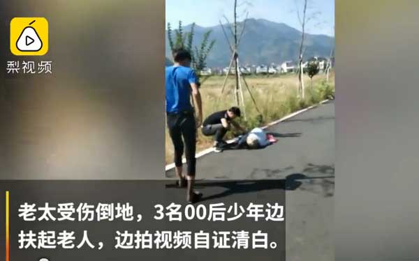 实拍浙江一老太倒地3男孩边扶边录像证清白现场视频