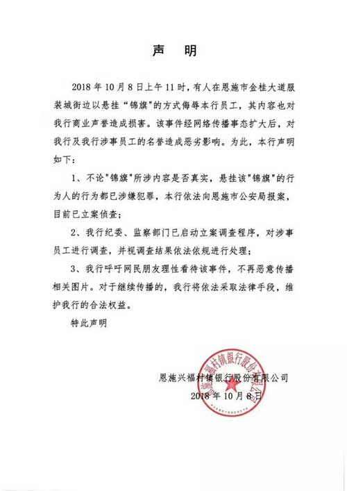 针对此事,恩施兴福村镇银行在微信公众号上发文回应:有人在恩施金桂大道服装街边以悬挂“锦旗”的方式侮辱本行员工,其内容也对我行商业声誉造成损害。该事件经网络传播事态扩大后,对我行及我行涉事员工的名誉造成恶劣影响。为此我行声明如下:不论“锦旗”内容是否真实,悬挂该“锦旗”的行为人的行为都已涉嫌犯罪,本行依法向恩施市公安局报案,目前已立案侦查;我行纪委、监察部门已启动立案调查程序,对涉事员工进行调查,并视调查结果依法依规进行处理;我行呼吁网民理性看待该事件,不恶意传播相关图片。对于继续传播的,我行将依法采取法律手段,维护我行的合法权益。