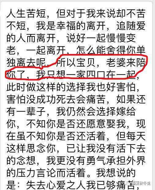戴女士绝笔信内容:人生苦短,但对于我来说却不苦不短,我是幸福的离开,追随爱的人而离开,说好一起慢慢变老,一起离开,、怎么能舍得你单独离去呢,所以宝贝,老婆来陪你了,我只想一家四口在一起,此时做这样的选择我也好害怕,害怕没成功死去会痛苦,如果还有一辈子,我仍然会选择嫁给你,不知你是否还愿意娶我,现在虽不知你是否还活着,但每天这样思念你,已让我没有活下去的念想,我更没有勇气承担外界的压力言论而活着。我想说的是:失去心爱之人我已够痛苦