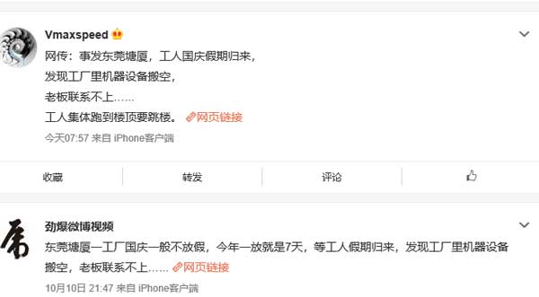 据网友曝光:东莞塘厦一工厂国庆一般不放假,今年一放就是7天,等工人假期归来,发现工厂里机器设备搬空,老板联系不上…工人集体跑到楼顶要跳楼……