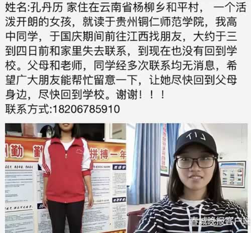 今年20岁的孔丹历,就读于贵州铜仁师范学院,宣威市杨柳乡和平村人。孔丹历的父母介绍说,她是一个很开朗活泼的女孩,国庆期间对父母说,她要去江西找同学玩几天。放假当天,她就去了江西。去之前,她还跟妈妈通电话说,她的同学在江西给她买了火车票,让她国庆去江西玩。