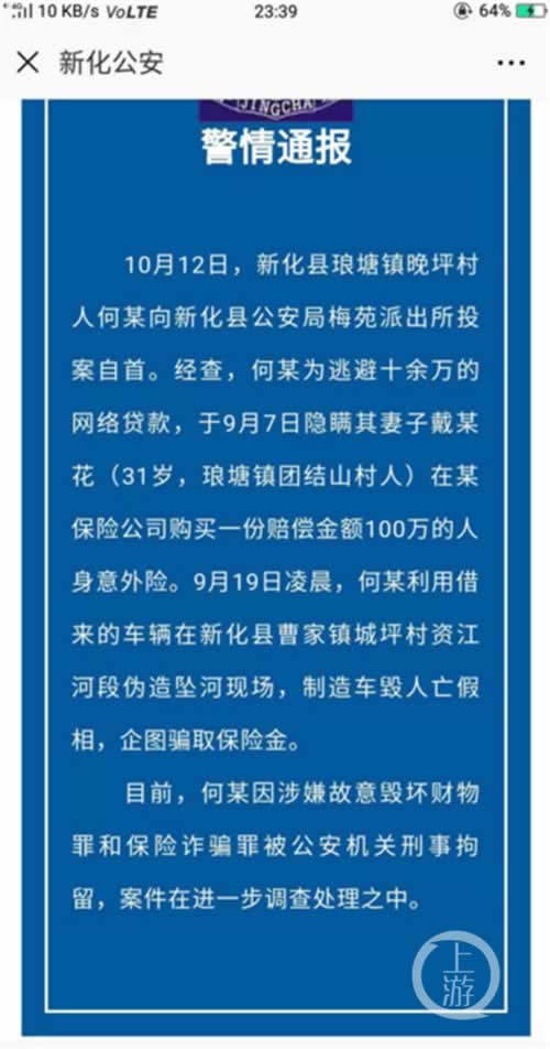 10月12日深夜,湖南新化县公安局长欧阳灼亮向上游新闻介绍,戴某花丈夫何某失踪之谜已调查清楚,何某欠下贷款之后,欲制造自杀假象,骗取百万保险。