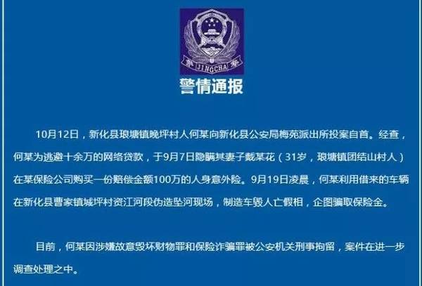 据新化公安通报,10月12日,何某投案自首。经查,何某为逃避十余万的网络贷款,于9月7日瞒着其妻子戴某花在某保险公司购买一份赔偿金额100万的人身意外险。9月19日凌晨,何某利用借来的车辆伪造坠河现场,制造车毀人亡假相,企图骗取保险金。