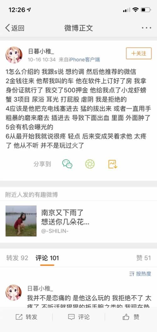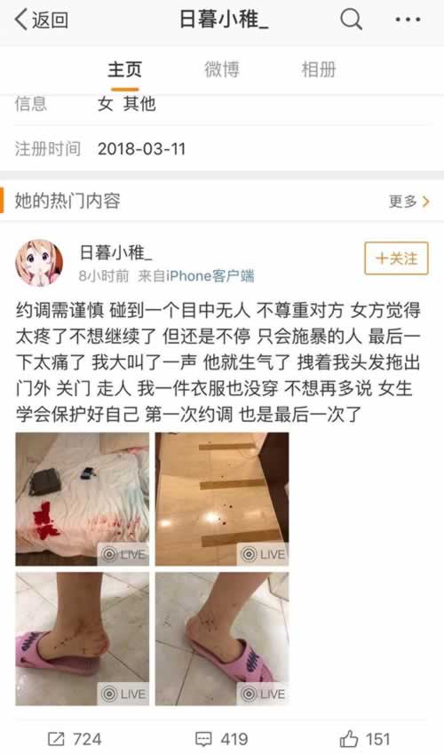 昨天上午,受害的小m在微博发文称自己约调(狐狐科普:就是约调教的意思)被约来的男s坑了一把,男s不仅在做的过程中不尊重人,最后一下弄的太痛了,小m叫了一声,男s就生气的把什么都没穿的小m扔到门外,然后关上了门。
