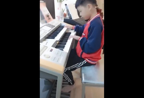 11岁的杨宇华现在读6年级,他说自己3岁半(虚岁5岁)学钢琴 ,学到9岁,然后又学了近3年双排键,“每天都会坚持练,一首曲练熟后会陶醉其中。”