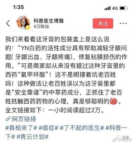 网友@科普医生博雅微博消息称:昨天下午我去超市买东西了,正好家里的牙膏没剩下多少了,我就顺手从货架上拿下来了一个“YN白药”,这只牙膏虽然说价格比较贵点,但刷起牙来确实感觉不错,而且这家牙膏的广告词“牙龈出血就用YN白药”也是耳熟能详。