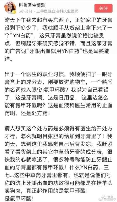 病人想买这个处方药是必须得有医生给开处方才行,怎么就明目张胆的给加到牙膏里了!我的天,想到这里我感觉自己后背发凉,我赶紧看了看货架上的其它中草药牙膏的成分表,很快我的心就凉透了,很多种号称能防止牙龈止血的牙膏里都有氨甲环酸!什么YN白药、三七..这些中草药牙膏里都有,也就是说他们号称的防止牙龈出血的功效很可能都是在挂羊头卖狗肉,真正起作用的是氨甲环酸!
