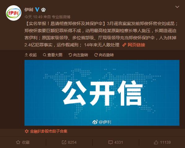 10月24日上午,伊利公司在企业官方网站发出举报信,公开举报郑俊怀等人,声称郑俊怀索要巨额犯罪所得不成,动用最高检某原副检察长等人施压,长期造谣迫害伊利,多位省部级、厅局级领导均充当郑俊怀保护伞,人为抹掉2.4亿犯罪事实,运作假减刑,14年来无人敢处理。