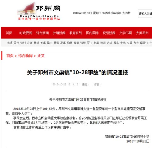 2018年10月28日上午10时55分,邓州市文渠镇渠首大道一重型货车与一小型客车碰撞引发交通事故,造成多人伤亡。