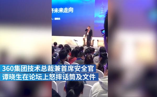 实拍不满计算机大会拖堂360副总裁谭晓生怒摔话筒现场视频