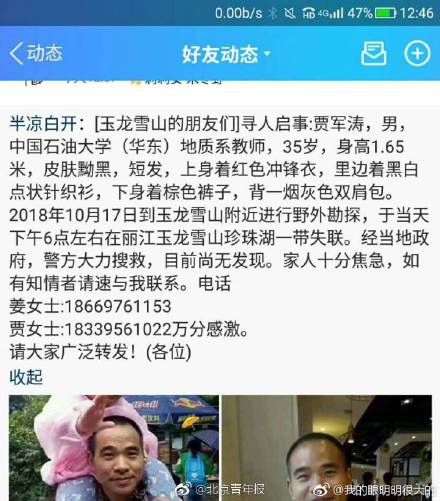中国石油大学(华东)官网显示,贾军涛今年35岁,2010年进入高校工作,为地球与科学技术学院地质系讲师。贾军涛家人曾在微信公号上发布“寻人启事”,称贾军涛10月17日到云南省玉龙雪山附近进行野外勘探,于当天下午6点左右在丽江玉龙雪山珍珠湖一带失联。
