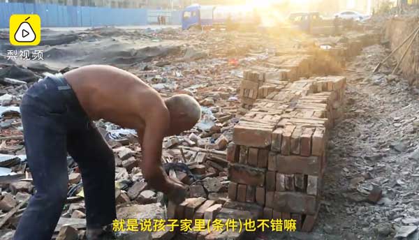 实拍洛阳6旬大爷冬日打赤膊捡砖现场视频