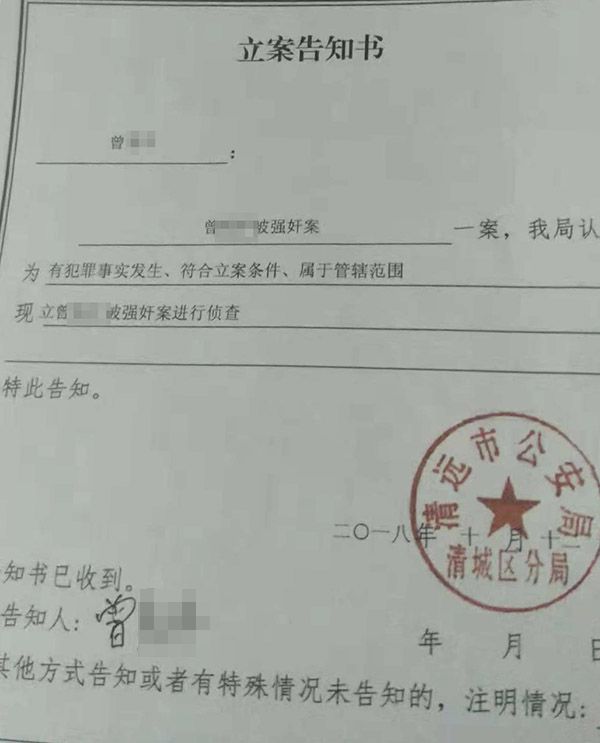 她还向记者提供了的一份《立案告知书》显示,对于曾丽被强奸一案,清远市公安局清城分局认为有犯罪事实发生,符合立案条件,属于管辖范围,已立案进行侦查。落款时间为10月12日。