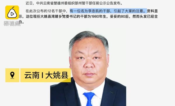 云南省楚雄州委组织部发布干部任期公示引发关注。出生于1980年8月,现任大姚县湾碧乡党委书记的李忠凯,因照片显老被疑年龄。大姚县委宣传部副部长回应称,照片是本人,工作地方艰苦压力大,使其看上去显老。